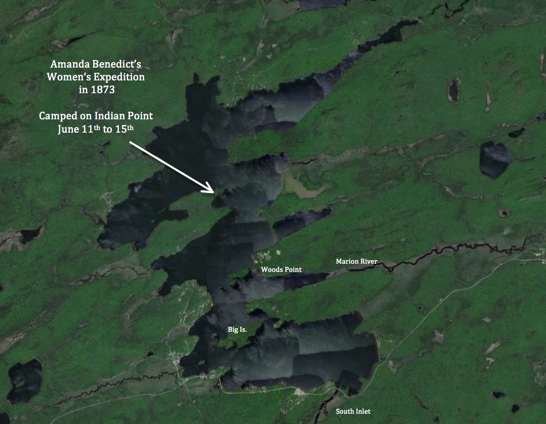 A number of places could have served for their base camp, perhaps Big Island or Woods Point, which both lie between South Inlet and the mouth of the Marion River that leads to Blue Mountain Lake. Indian Point was out of their way and double the distance from South Inlet. Hough and Plumley must have proposed the use of their former property for the base camp.
