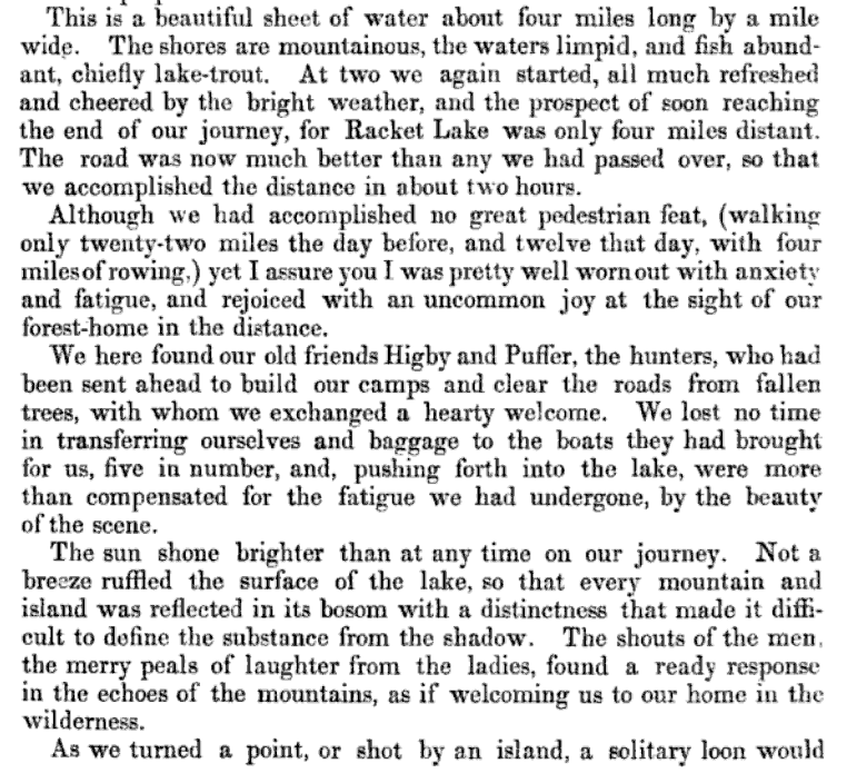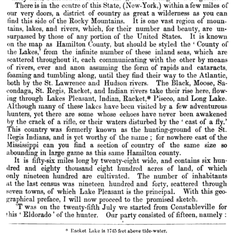 Few fully understand what the Adirondack wilderness really is. It is a mystery even to those who have crossed and recrossed it by boats along it avenues, the lakes; and on foot through its vast and silent recesses…In this remote section, filed with the most rugged mountains, where unnamed waterfalls pour in snowy tresses from the dark overhanging cliffs…the adventurous trapper or explorer must carry upon his back his blankets and heavy stock of food. Yet, though the woodsman may pass his lifetime in some of the wilderness, it is still a mystery to him. 1