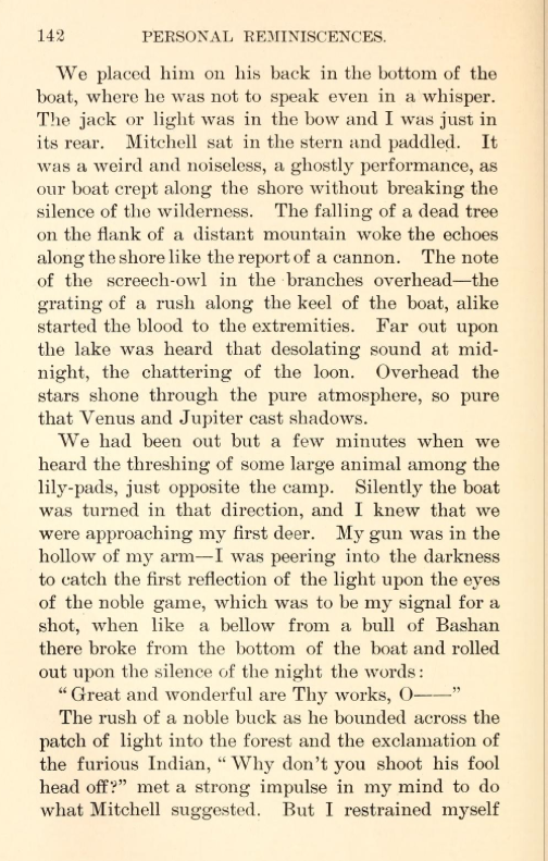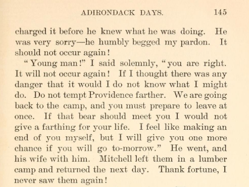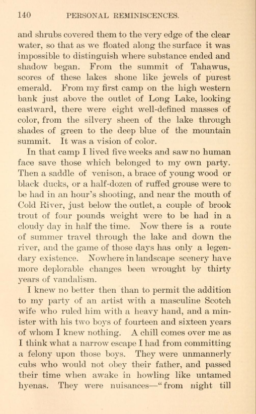 The enmity of other guides was also stoked by Dunning’s fierce belief in his right to unfettered use of the land and to kill game any time of year. Mather writes of visiting Dunning again in 1882 when Alvah complained;