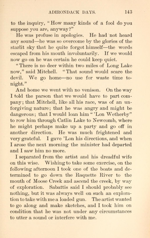 Times is different now, an’ wus. In them days nobody said a word if a poor man wanted a little meat an’ killed it, but now they’re a-savin’ it until the dudes get time to come up here an’ kill it, an’ some of ’em leave a deer to rot in the woods, an’ on’y take the horns ef it’s a buck, or the tail ef it’s a doe, just so’s they can brag about it when they go home, an’ they’d put me in jail ef I killed a deer when I needed meat. I dunno what we’re a-comin’ to in this free country. 7